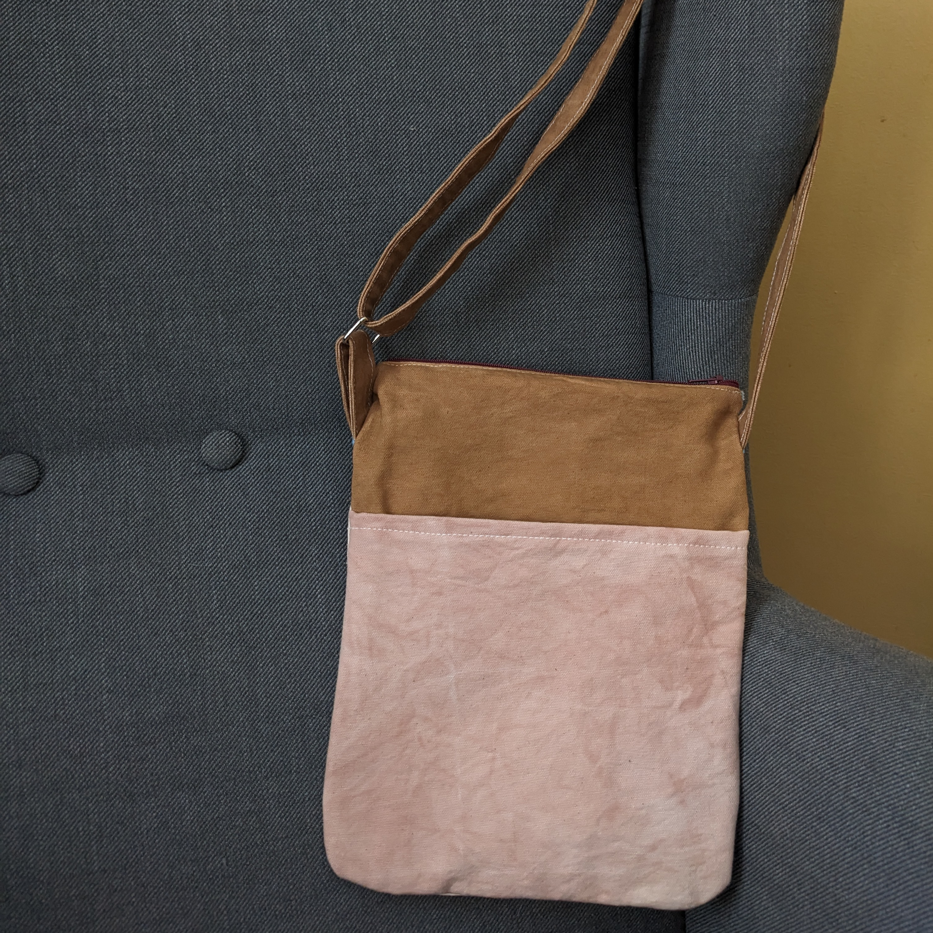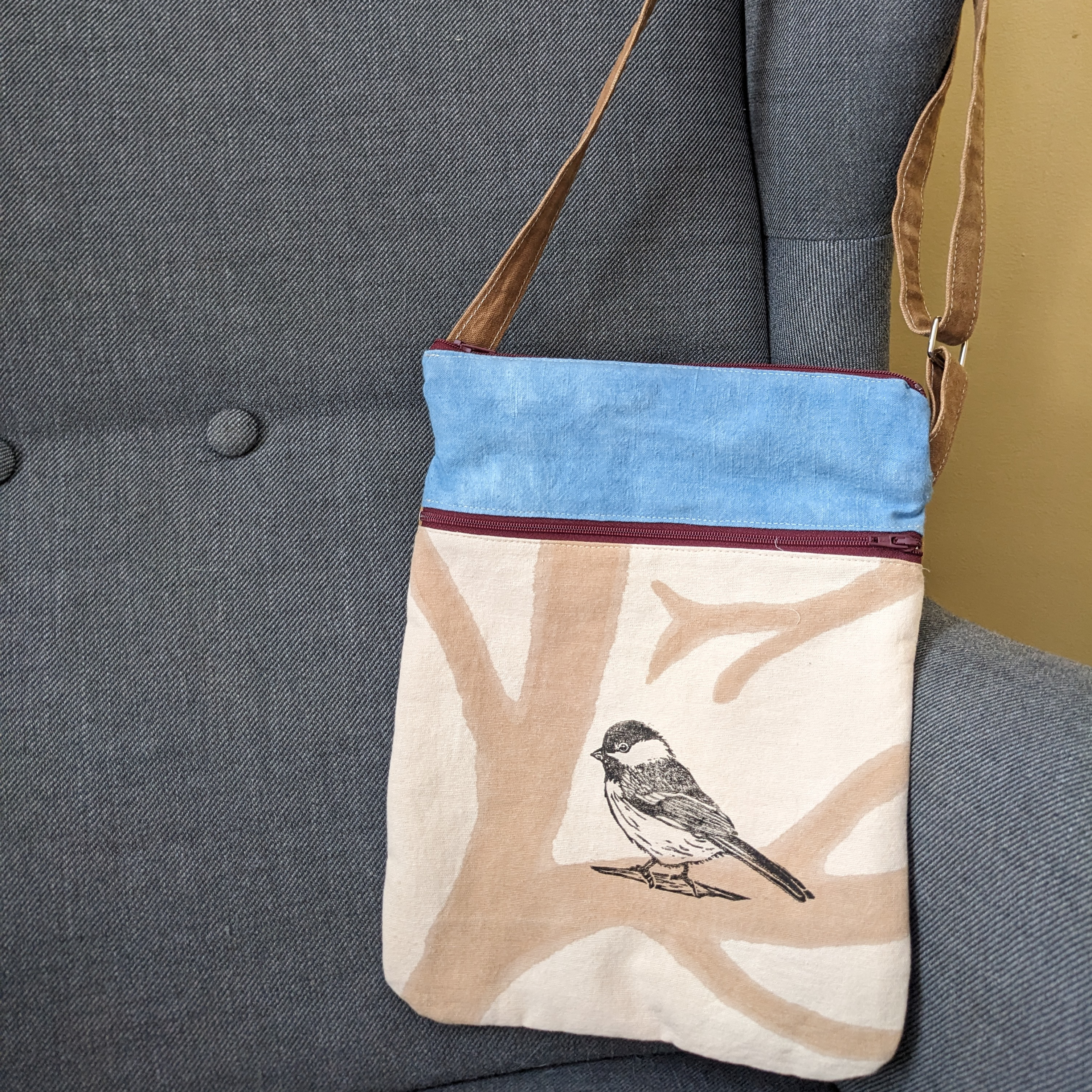 Small Crossbody Essentials Bag, block printed with a chickadee linocut. It features an adjustable strap, zipper closer, zipper pocket and a slip pocket on the back. Dyed with fir branches, home grown indigo and onion skins, and avocado pits.