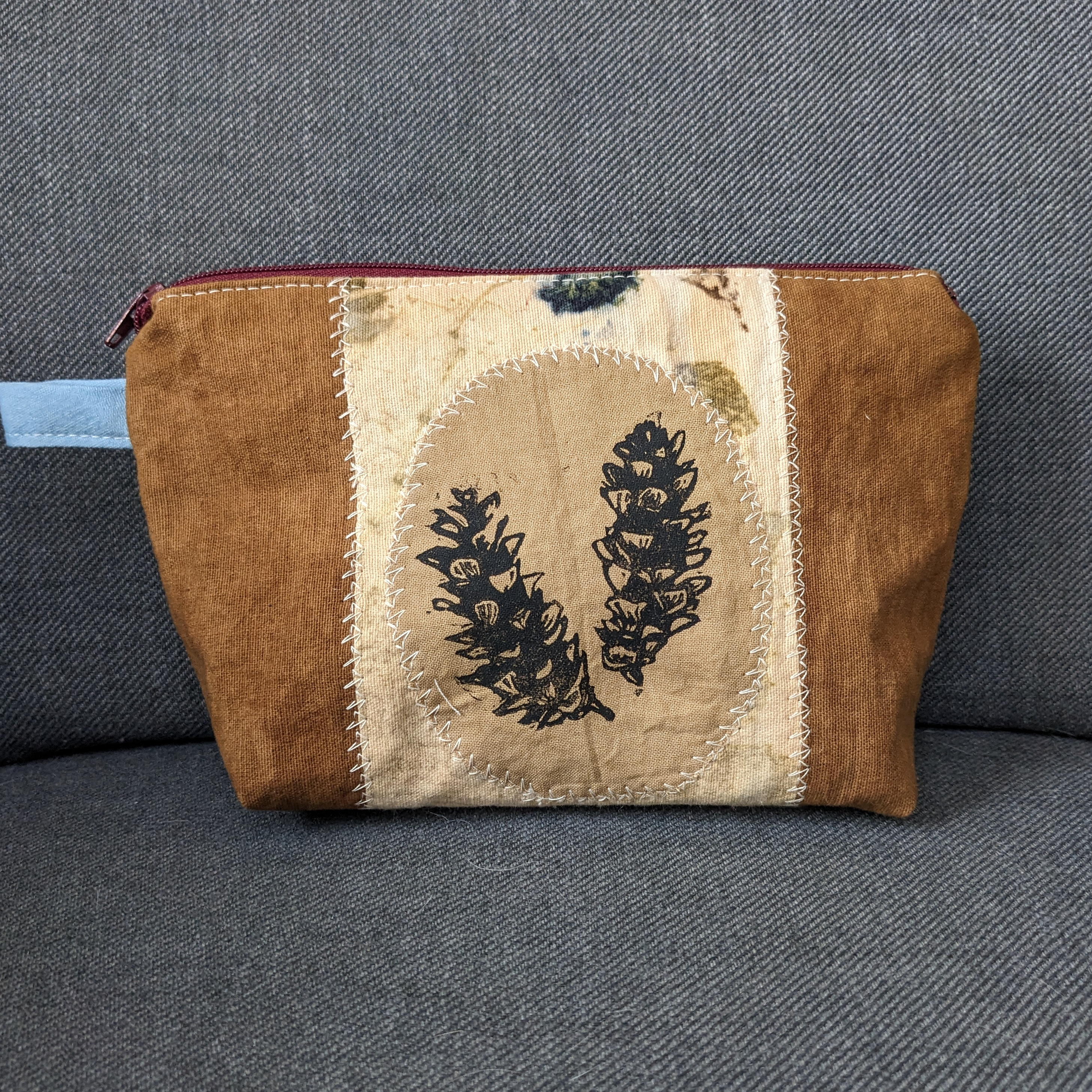 Pieced and appliqued with various pieces of plant dyed fabrics and block printed with my pine cone linocut.