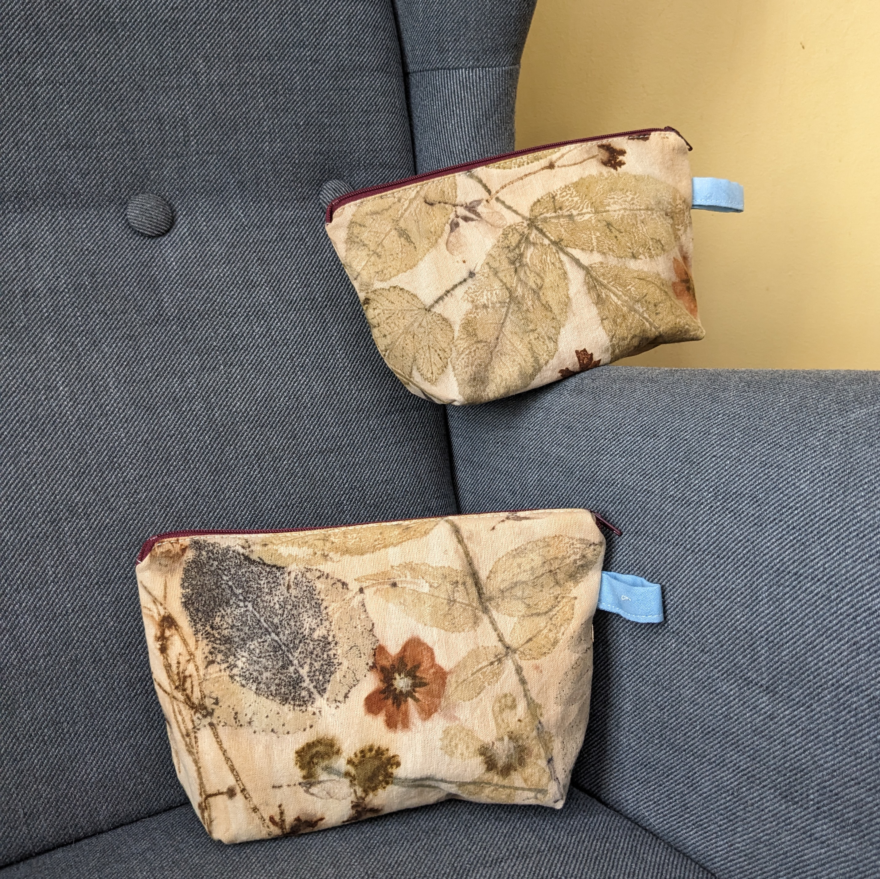 Eco-printed with homegrown flowers and locally foraged leaves. Please note that each pouch is unique and will not be exactly like the ones pictured.