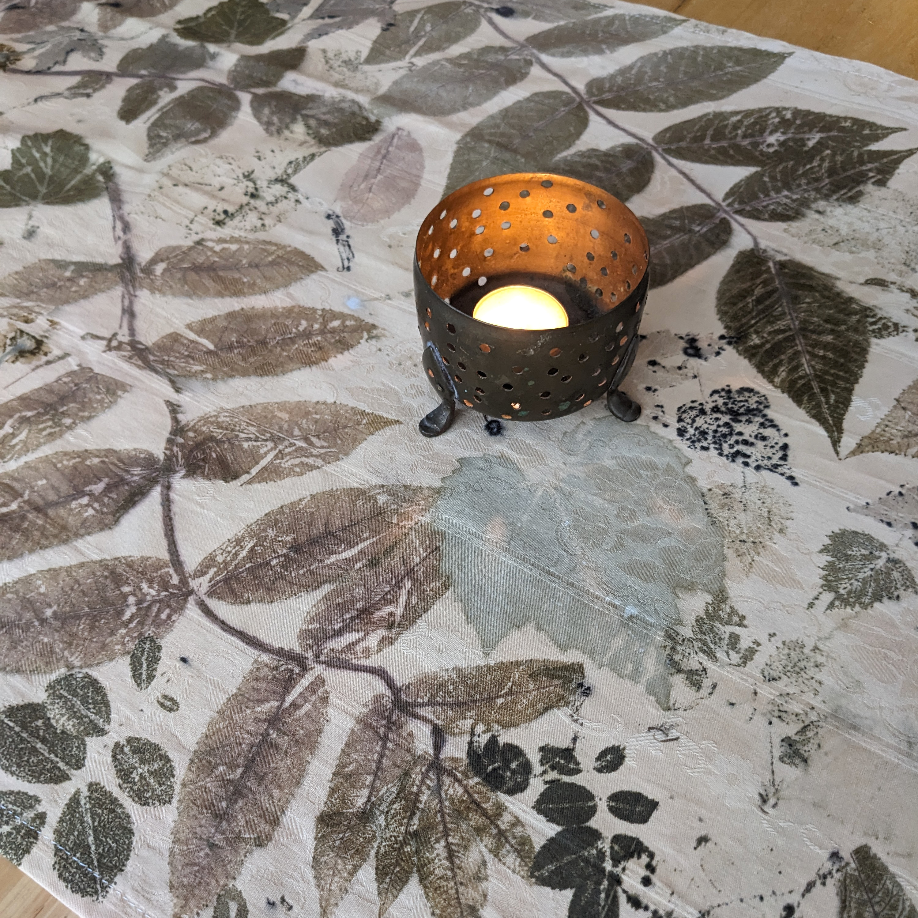 This table runner is eco-printed with leaves foraged from around my neighbourhood and other places in Manitoba.