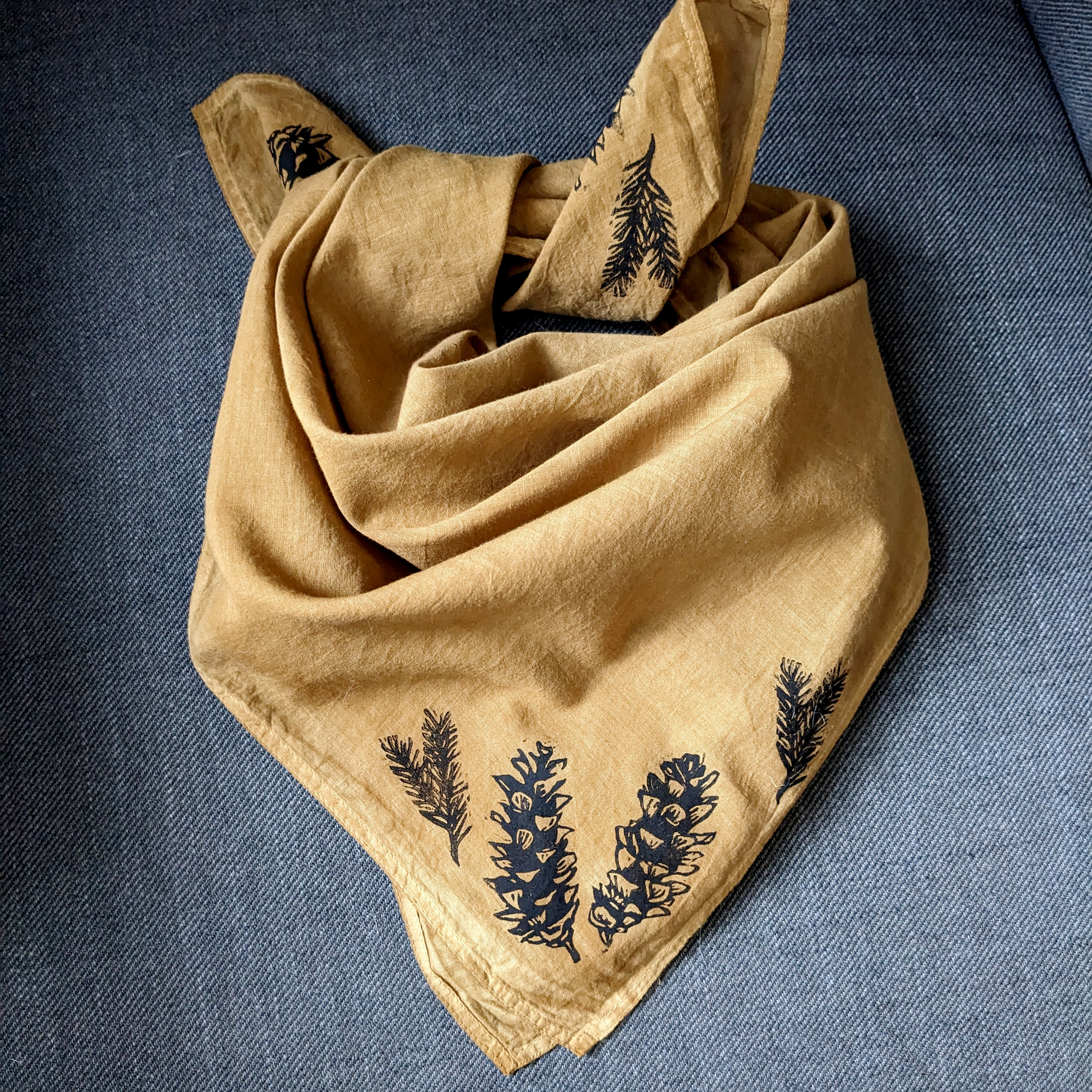This organic cotton bandana is naturally dyed with sulfur cosmos flowers from my garden, and block printed with my original linocut stamps of pine cones and branches.
