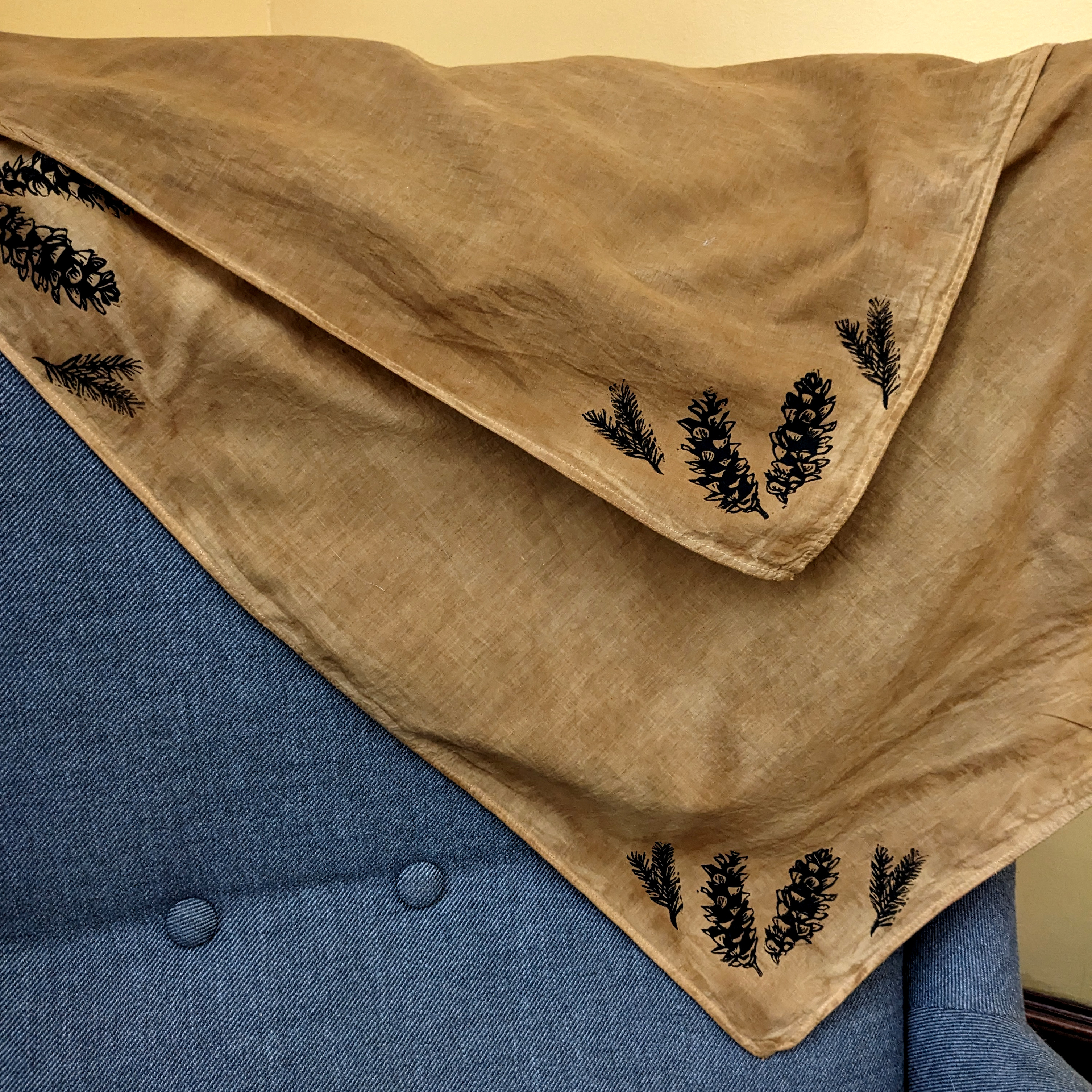 Plant dyed and block printed bandana, Pine Cones